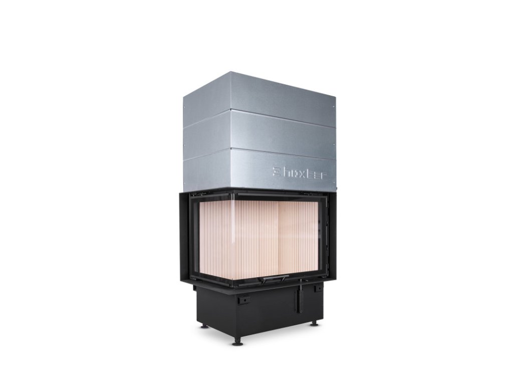 Hoxter - Teplovzdušná krbová vložka - KV ECKA 67/45/51, horevýsuvné dvierka, oceľový výmenník 90°, čierne, ľavá, jednoduché presklenie - 12 kW