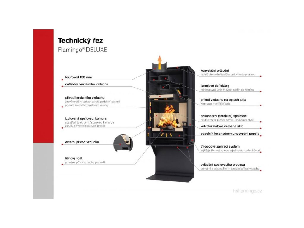 Systém spaľovania u kachlí Flamingo DELUXE je dokonalosť sama. Prísun vzduchu je zaistený centrálne zo zadnej časti kachlí. Množstvo popola je minimálny. Celý spaľovací proces je ovládaný dvoma tiahlami, kedy prvý slúži na reguláciu primárneho vzduchu, potrebného k rozhoreniu dreva. Druhé tiahlo slúži na podporu sekundárneho spaľovania, teda spaľovanie plynov. Jeho otvorením dochádza k prísunu terciálneho predhriateho vzduchu do hornej časti, ktorý je vháňaný do komory pomocou vrchného deflektora. Tento vzduch sa používa na úsporný a čo najefektívnejší priebeh horenia dreva. Týmto je zaistená vysoká účinnosť a krásne horenie vrátane čistého skla. Na zabezpečenie správneho spaľovania je potrebný správny ťah komína, ktorý docielite umiestnením regulátora.