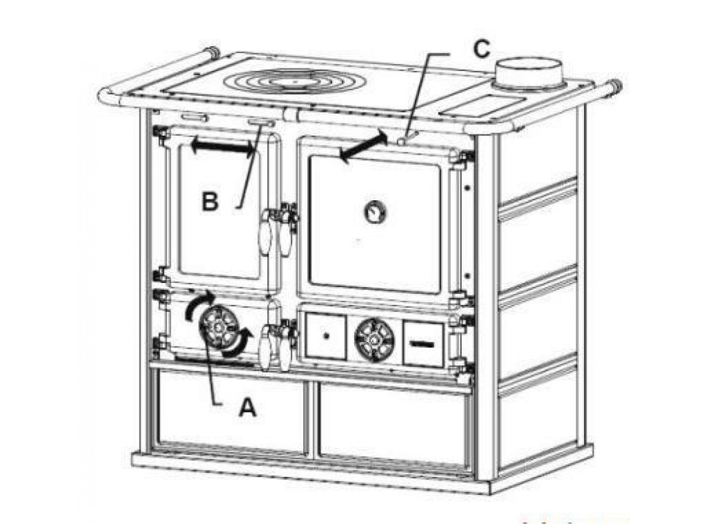 Sporák je vybavený mechanickou prepínacou klapkou pre jednoduché a rýchle vyradenie rúry na pečenie z prevádzky, napr. pri letnom varení alebo pri rozkurovaní sporáku. Spaliny tak odchádzajú z ohniska rovno pod platňou do komína alebo pod platňou a dookola celej rúry na pečenie a následne v zadnej časti do komína. Regulácia výkonu sporáka je pomocou dvoch ovládacích prvkov pre primárny a sekundárny vzduch. Do ohniska je ešte nasávaný prudko predhriaty terciálny vzduch pre lepšie prehorenie paliva a nižšie emisie výstupných spalín. Pod roštom je ľahko odnímateľný popolník. Priestor pod rúrou môže slúžiť pre ohrievanie, sušenie, uchovanie teplých pokrmov alebo len ako úložný priestor na plechy a rošty. V spodnej časti je výsuvný úložný priestor na drevo alebo na príslušenstvo k sporáku.