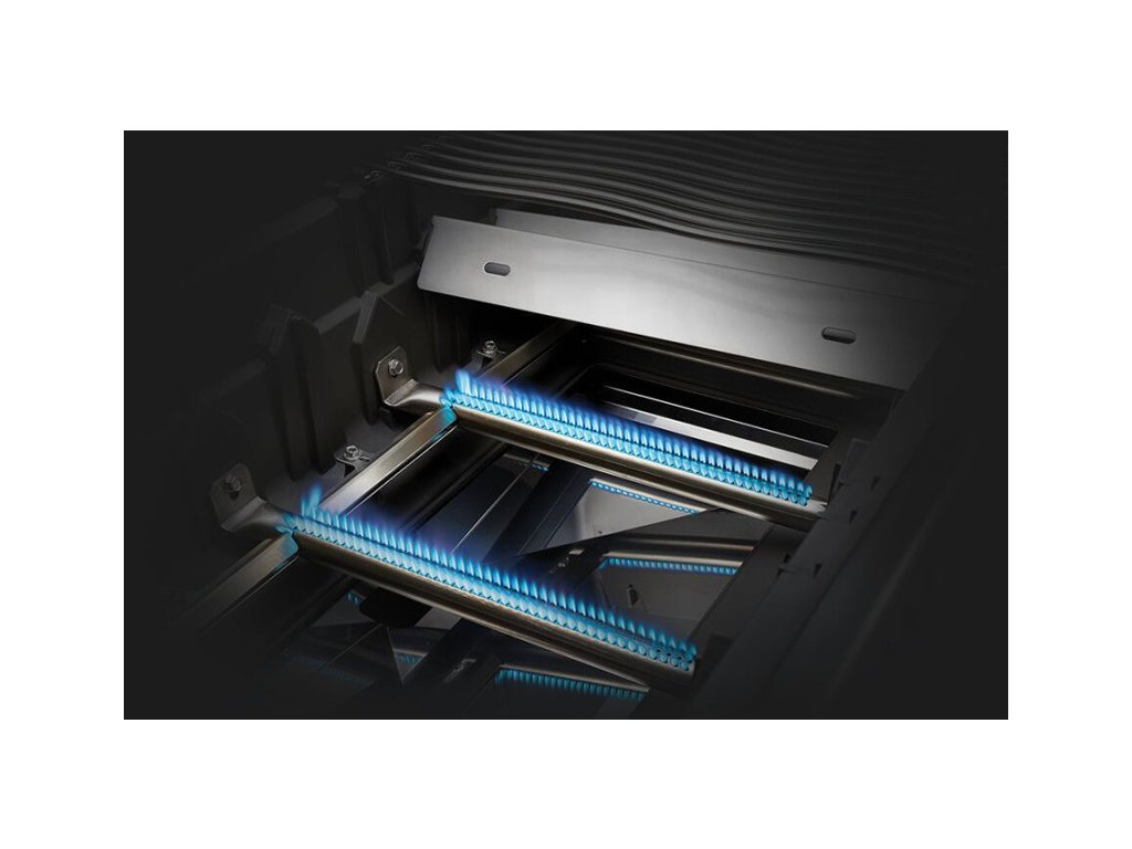 - Gril má celkom 3+2 horáky. Tri hlavné nerezové so špeciálnymi krytmi, aby sa do trysiek horákov nedostalo nič, čo tam nepatrí. Tie sú navyše vybavené systémom vzájomného zapaľovania, takže keď náhodou pri zapaľovaní nechytia všetky, zapália sa navzájom od seba. Gril ďalej disponuje zadným horákom pre ražeň a jedným bočným infračerveným (tzv. Sizzle Zone).