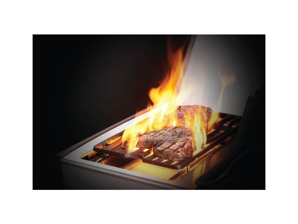 - Dvojica infračervených horák dokáže vyvinúť teplotu až 800 °C. Vďaka tomu na ňom perfektne zatiahnete steak a všetka šťava zostane vo vnútri.