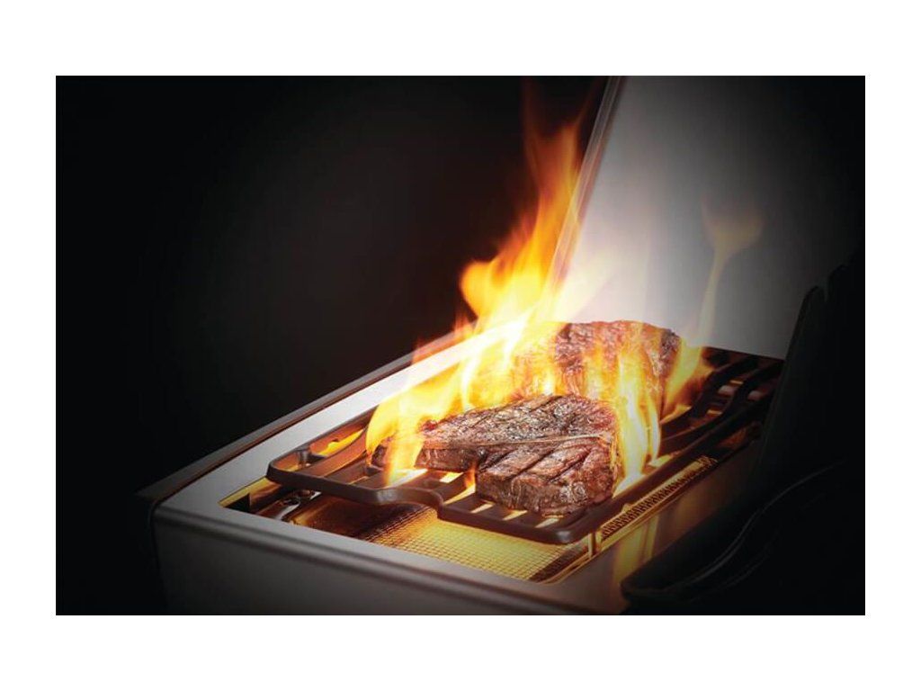 Dvojica infračervených horák dokáže vyvinúť teplotu až 800 °C. Vďaka tomu na ňom perfektne zatiahnete steak a všetka šťava zostane vo vnútri.