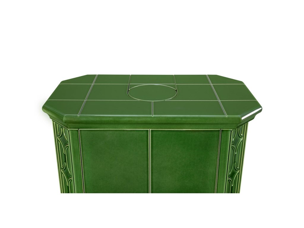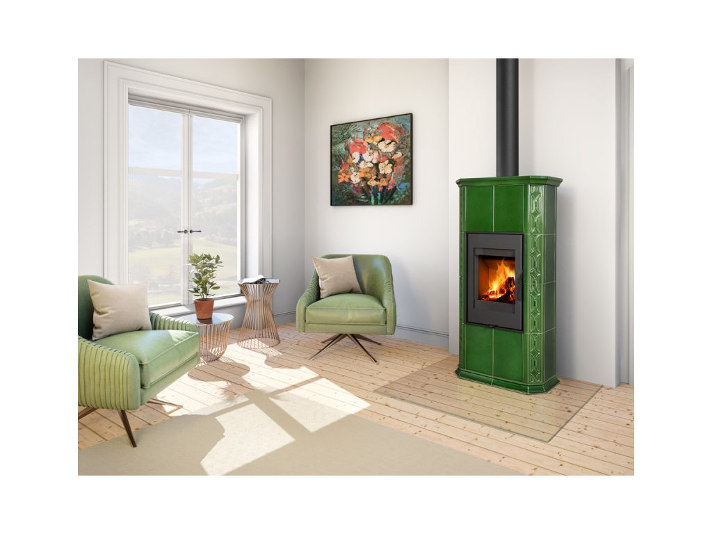 Kachľové pece s čiastočnou akumuláciou do keramického plášťa, kombinovaný spôsob vykurovania - konvekcia / sálanie. Moderné ohniska značky Romotop s centrálnym (externým) prívodom vzduchu do spalinovej komory tzv. CPV s priemerom 125mm, dvierka s dvojbodovým uzáverom pre maximálnu tesnosť. Rýchla a presná regulácia primárneho / sekundárneho vzduchu jedným ovládacím prvkom. Čisté sklo vďaka vhodne navrhnutému prívodu sekundárneho vzduchu. Vysoká účinnosť ohrievača s hodnotou 80,6% znamená nízku spotrebu paliva a ekologické spaľovanie. Obklad kľučky z masívneho dreva pre dosiahnutie nízkej povrchovej teploty.