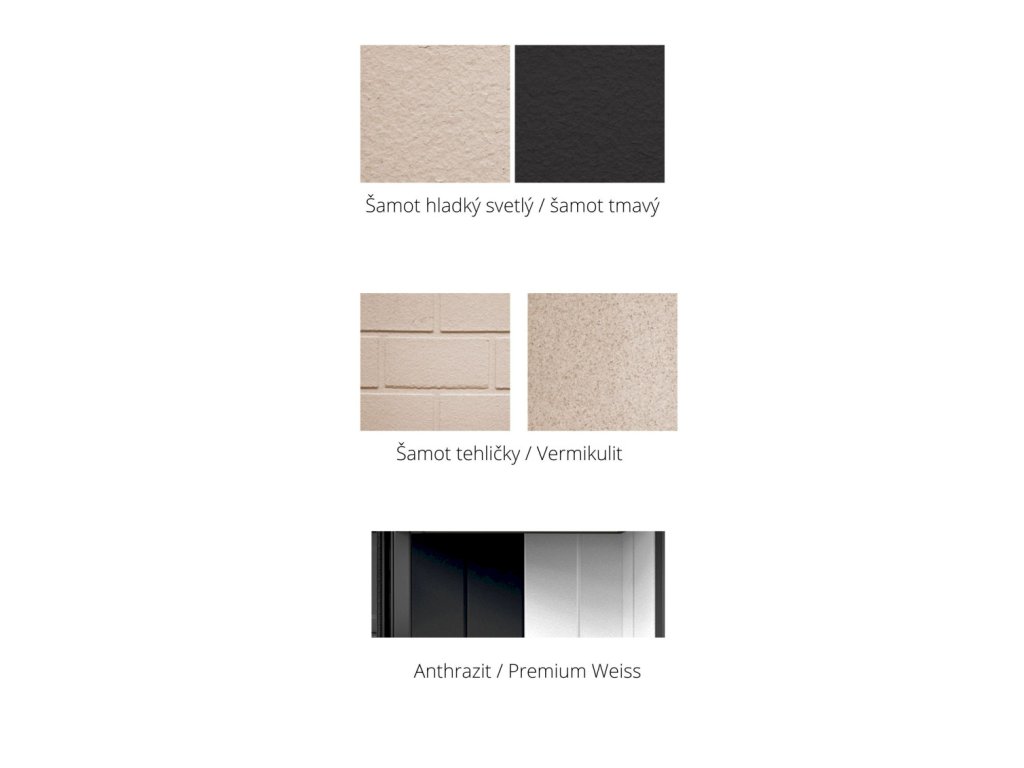 - jadro podľa voľby: šamot svetlý, šamot čierny, vermikulit, vzor tehličky alebo hladký