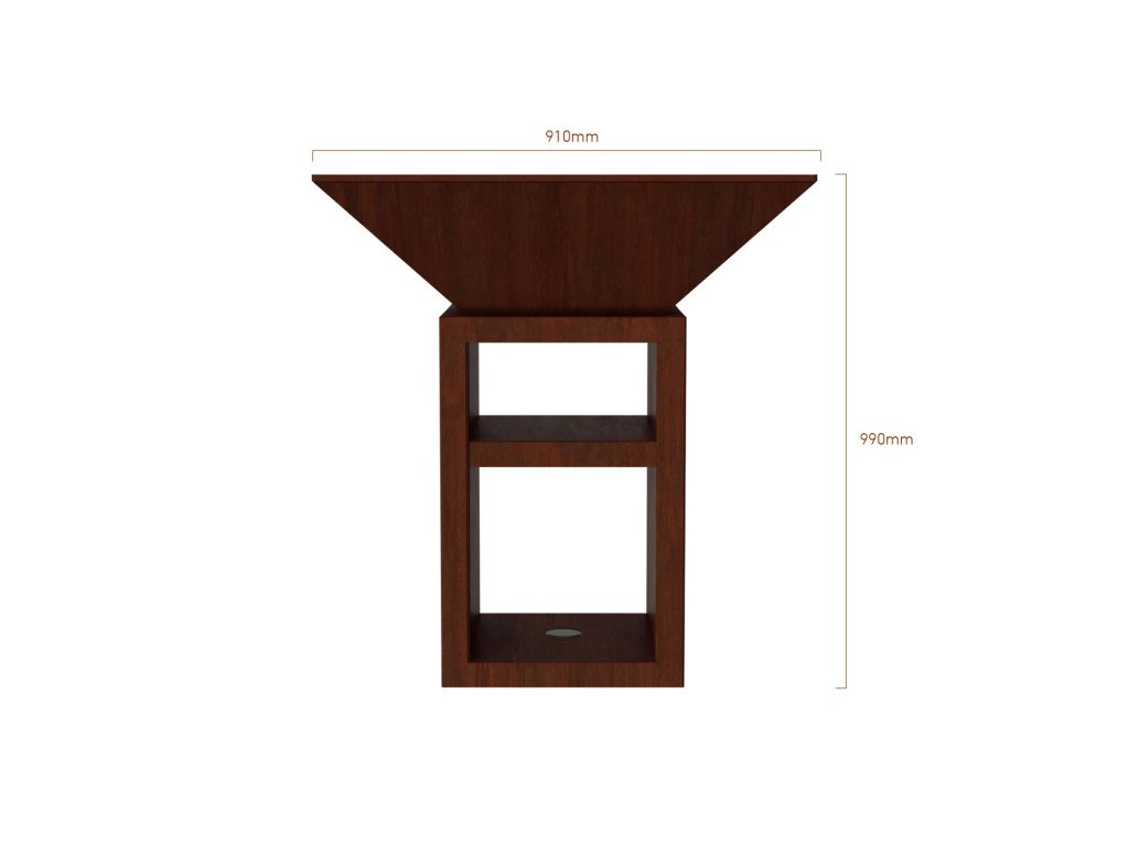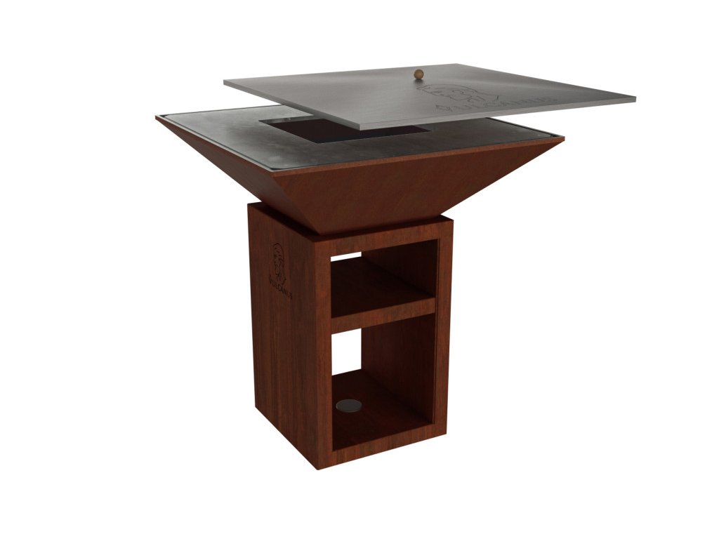 Užite si profesionálny spôsob grilovania postojačky. Súčasťou Vulcanusu Pro910 Chef (grilovacia platnička 910 x 910 mm) je podstavec, v ktorom nájdete dostatok miesta na drevo aj na odkladanie riadu a potravín.